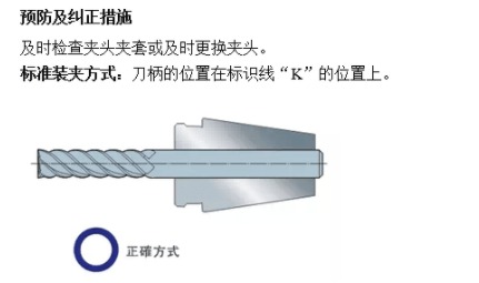 如左圖,箭頭所示位置,裝夾位置距標識線“K”太遠,更甚的個別只夾在刀柄的中間位置或三分之一位置上,這樣裝夾為過淺。
