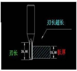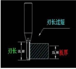 板厚為15mm,刃口長度為18mm,這現(xiàn)象為口過短。由于刃口過短,排屑空間不足,導(dǎo)致刀具切削阻力增加,同時會產(chǎn)生木屑重復(fù)加溫摩擦,這樣也容易引起斷刀的現(xiàn)象。